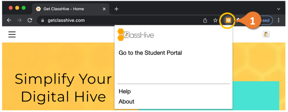 Click on the newly pinned ClassHive logo (1) to expand this menu. You can now “Go to the Student” portal through this extension and access all your ClassHive resources.