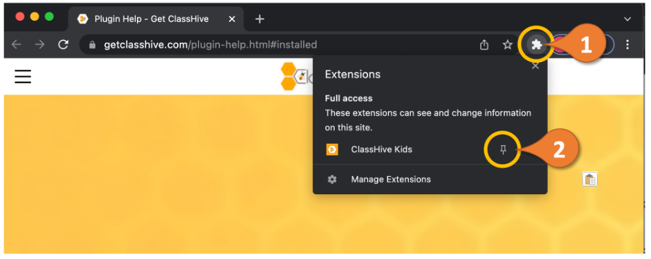 Click on the extension icon (1) to how all extension and then select the pin (2) for ClassHive to fix it to the toolbar.